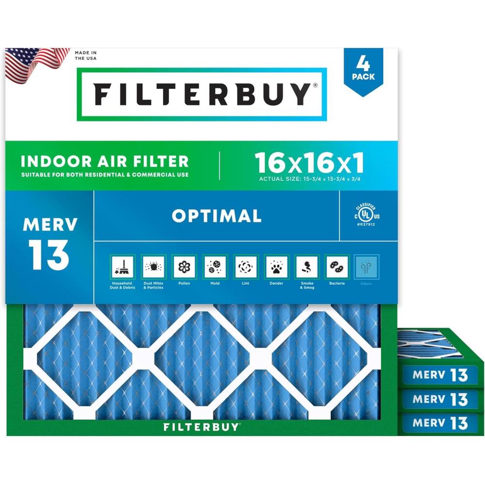 Filterbuy 20x24x2 Air Filter MERV 13 Optimal Smoke & Allergy Defense (4-Pack), Electrostatic Pleated HVAC AC Furnace Filters Replacement, Made in USA (Actual Size: 19.38 x 23.38 x 1.75)(16x16x1)